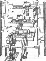 Издавна научившись использовать энергию водяного потока, изобретатели взапуски сочиняли все новые дикованные системы подъема воды из реки. Гравюра XVIIв.