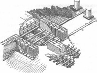 Это, конечно, крайние случаи. Обычно и самые величественные стены воздвигались из больших, но все же подъемных камней, или из кирпича, с использованием как насыпей, так и подмостей. Стремясь к разумной экономии усилий, древнейшие зодчие чрезвычайно рано изобрели многослойную конструкцию стены. Если строили из тесаного камня, то возводили наружную стену потолще, внутреннюю -потоньше, тогда как промежуток между ними заполняли, засыпая камни, землю, всякий строительный сор, утрамбовывая все вместе или заливая жидким известковым раствором. На илистых равнинах Месопотамии стену устраивали проще, слой за слоем укладывая сырцовые кирпичи из глины, смешанной с соломой. Под тяжестью верхних слоев нижние слипались намертво, а так как дождя в тех краях почти не бывает, эти необычайно толстые стены стояли веками, а когда, наконец, верхний их уровень разрушался совсем и перекрытия обрушивались вниз, на месте города-крепости возникал холм.
