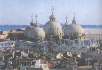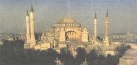 Современный вид храма Св. Софии в Стамбуле имеет немного общего с тем, как храм воспринимался жителями Византия-Константинополя. Естественно, следует мысленно убрать минареты, но главное в другом - храм был обстроен со всех сторон, и у него строго говоря не было фасадов. Над городом парил единственный плоский купол, подлинная же художественная программа развертывалась в интерьере, где над единым зальным пространством парило искусственное "небо", мерцавшее золотой мозаикой.