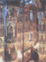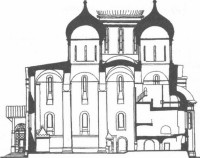 Нет сомнения, что существо православной церковной традиции нашему мастеру пытались объяснить неоднократно, но нет сомнения и в том, что понять ее болонцу было очень трудно. Приходится предположить, что Фьораванти съездил в свите Великого князя в Троице-Сергиев монастырь. Это тем более вероятно, что в тот год праздник Троицы пришелся на 7 мая - месяц после приезда, за месяц до начала работ над фундаментами. Скорее всего, только побывав в этом монастыре, где в соборе уже был установлен многоярусный иконостас, архитектор уяснил, что он и его заказчики совершенно по-разному представляли себе необходимое. В отличие от католической традиции, где главный алтарь расположен внутри храма и только его задняя стенка может разрастаться в барьер (не доходящий до верху), в византийской традиции алтарь - за преградой и скрыт от глаз мирян. На Руси с начала XV в. преграда преобразуется в многоуровневый иконостас, полностью отгораживающий алтарь от собравшейся в церкви паствы. Только теперь Фьораванти осознал новые для него элементы задачи, плохо согласовывавшиеся с избранной им планировочной схемой: шесть круглых столбов и девять "чистых" квадратов, алтарная преграда за последним по продольной оси квадратом, а боковые, малые апсиды-ниши, возможно, предполагалось отвести для скульптур четырех евангелистов.