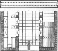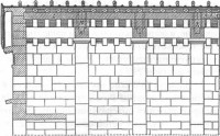 Углубив участок на три фута, считая от высшего уровня, и расчистив все остальное пространство, на этой плотно убитой площадке выложить и вывести [фундамент] равномерно до одной высоты и все по уровню. Выложить кладку и под столбами, отступая от каждой из двух [продольных] стен на пятнадцать футов, считая толщину столба.