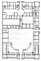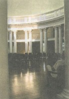 Однако и здесь Джефферсон оказался совершенно оригинален. Снаружи кажется, что это копия Пантеона - причем копия Пантеона в его первоначальном виде, когда центральный мощный портик был еще поддержан боковыми портиками, обрамляющими длинную площадь. Внутри это впечатление сначала полностью обмануто - на первом этаже, по обе стороны центрального прохода, местятся ректорские залы, овальный план которых приводит сразу на ум залы городских дворцов французского барокко. При подъеме на второй этаж, где первоначально размещалась библиотека, образ Пантеона возникает вновь, так как в центре полусферического купола устроен "окулюс" (естественно защищенный круглым "фонарем", но изнутри этого не видно).