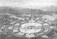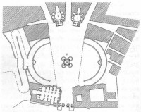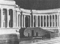 торжеств. Глубокая внутренняя неправда (ведь толпам предписывалось ликовать) словно прорывается наружу в преувеличенности масштаба. Над трибунами поднимался могучий строй колоннады, словно вырастающей из массы человеческих тел как их символическое иновыражение - "к бессмертной памяти будущих времен, ко украшению столичного города, к утехе и удовольствию своего народа",