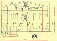 Все бы замечательно, но Витрувий не видел Парфенона! Смысл его слов не совпадает с приводимыми им числами, ведь крепость и красота тела, несущего тяжесть, предполагает, что из человеческой фигуры исключена шея. Недаром атланты храма в Акраганте прижимают подбородок к груди и несут балки архитрава руками, согнутыми в локте и прижатыми с обеих сторон к голове, принимающей на себя груз в наиболее удобной для этого позе. Если вспомнить, что греческое название ствола колонны - "сома", то есть "тело", все становится на свои места. Ведь действительное отношение между толщиной ствола колонны Парфенона у его основания к высоте ствола до капители (напомним, что "капитель" и есть "голова") отнюдь не 1:6, а 1:5.