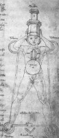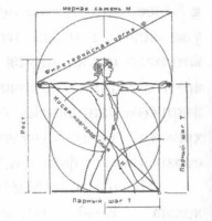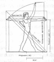 Двойной шаг, т. е. высота тела, относится к полному росту как 5:6, или 0,833. Размах рук обычно на три сотых больше полного роста -1,030. Нетрудно заметить, что отношение 0,833 к 1,030 составляет 0,809, или 1: (V5 -1). Отношение величины человека с поднятой рукой к размаху его рук составит 1,030:1,260, то есть 0,819 - тоже почти точно 1: (V5-1)., а отношение двойного шага к величине фигуры с поднятой рукой составит 0,833/1,260 = 0,663, или почти точно 2:3.