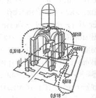 21 мерную сажень, мы получим длину ядра (1008 см). Теперь отношением 0,618, или в золотом сечении, мы без труда получим и общую ширину подкупольного прямоугольника: 21 х 0.618 = 623 см, что составит ровно 13 локтей мерной сажени. Отложив по 13 локтей уже простой сажени в обе стороны от ширины подкупольного ядра, мы получим гармоническое их соотношение - все те же 0,809. И т. д., вплоть до того, что ширина средних, плоских пилястр — лопаток (3 мерных локтя или 144 см) на фасаде точно так же определяет собой и ширину боковых лопаток (3 простых локтя - 116,5 см), через стабильное отношение 0,809!