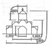 С конца XII в. византийский канон скачком подменяется новым, русским, как бы и не меняясь по существу. Новгородские храмы,возведенные с помощью мерной трости, упомянутой выше, иллюстрируют это со всей определенностью. И. Ш. Шевелев, в 60-е годы XX в. исследовавший церкви Рождества Перынского скита, Петра и Павла на Синичьей горе (1185 г.) и Спаса Нередицы (1198г.), твердо установил, что все они построены парной мерой 1:(V5-1), в отношении 0,809. Церковь Петра и Павла на Синичьей горе построена этой парной мерой при мерной сажени 175,6 см (локоть 43,9 см) и парном шаге 142,4 см (локоть 35,6 см).