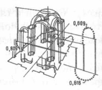 Итак, из ширины центрального ядра храма определялся его размер, охватывавший и центральный и боковые нефы, между которыми устанавливали пропорциональное отношение. Все же остальные размеры оказывались словно скрыты в центральном ядре, повторяя его точно или повторяя его меру, но при переводе уже в парную меру, так что полная высота четверика оказывалась производной от его ширины. При этом в храмах византийского корня все размеры обозначались по внутренним стенам, т. е. четко фиксировали характеристики пространства. Скажем, в Великой Печерской церкви пара мер составлена из мерной сажени 192 см, филетерийской оргии 214,8 см (в отношении 2:V5, то есть 0,894), и соответственного ей локтя в 53,7 см (в отношении 1 :V5). Если так, то мы еще до обмеров можем твердо сказать, что так будут соотноситься и ширина боковых нефов к срединному (1:V5), и ширина ядра к ширине храма (1:V5), и восточная ветвь креста плана к западной, и высота барабана от вершины столбов к ширине храма (1 :V5), тогда как высота до светового кольца под куполом соотносится с шириной храма в отношении 2:V5 и т. д. - цепь можно тянуть и тянуть.
