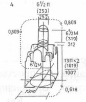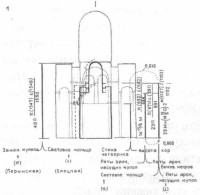 20 мерных полусаженей (1920 см), то за вычетом толщины двух стен (каждая по три мерных сажени) ширина храма по внутренним стенам составляет уже 17 таких полусаженей. Если теперь эту ширину измерить простой саженью, то получится 21, и тогда, отложив