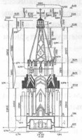 При этом в основании всей мощной мело-дической темы церкви Вознесения лежит прежде всего пропорциональное построение, заданное применением тьмутороканской и мерной саженей в вертикальном ритме, тогда как кубы и призмы в основании построены на сочетании тьмутороканской и косой новгородской саженей. Математические закономерности квадрата и двойного квадрата оказались здесь наложены одна на другую, и острое столкновение двух тем разрешается в вертикали венчающего креста, пропорции которого выстроены как 1:V5-1.