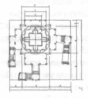 Развитая алтарная часть храма с обходной галереей соответствует голове и шее, хоры -грудной клетке, простертые в стороны нефы трансепта - рукам, неф - животу, западный же неф - ногам. В романских соборах нередко даже имитируется наклон упавшей на грудь головы распятого Христа, так что ось нефа заметно отклоняется направо от главной оси. Купол парит над средокрестьем нефа и трансепта, будучи отделен от массива стен световым потоком через окна барабана. Интерьер заполнен фресками, светом, музыкой хоралов. Соответственно само построение формы подчинено воплощению идеи и образа вместе, и с помощью мерной трости определяется главное - границы внутреннего пространства. Расчерченный на выровненном основании квадрат, означавший место арок, которым предстояло нести световой барабан и купол, является ключом к гармонически упорядоченному целому. В греческих текстах этот подкупольный прямоугольник именуется «мезомфалон» - в переводе «средоточие», при буквальном же переводе - «средопупие», ибо слово «омфалос» означало не только и не столько реальный пуп, точку роста, точку жизни, но и «пуп земли». Итак, центральное ядро роста храма составлено восемью линиями. Это вложенные один в другой квадраты, промежутки между сторонами которых суть проекции будущих главных арок и столбов на основание. Это и есть византийский канон.