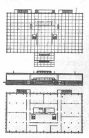 Члены всевозможных попечительских советов, теперь ощутившие себя безнадежно отставшими от современности, капитулировали впервые, когда Луис Кан осуществил в 1953 г. пристройку к Художественной галерее Йелль-ского университета. Первое здание, построенное четвертью века раньше в духе вариации романско-готического стиля, оказалось теперь вплотную приставлено к абсолютно гладкой призме из бетона, облицованного мелким кирпичом желтоватого оттенка. Единственным украшением фасада стали тонкие ленты бетона, отвечающие уровням перекрытий. Внутри -бетонные столбы со следами деревянной опалубки и единый потолок, набранный треугольными пересечениями множества монолитных балок.