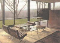 В Йелльском университете вскоре стало заметно: что бы, на какую бы тему ни проектировали — студенты, преподаватели, заезжие профессора, — результатом непременно оказывалась "коробка". "Йелльская коробка" стала именем нарицательным, и карикатуристы американских газет начали взапуски изображать The Yale Box, водружаемую с одинаковой отчужденностью посреди калифорнийской пустыни, в тундре и даже под водой. Читатели газет веселились, но ничего не менялось: коробка была повсюду, тем более что почти все архитектурные факультеты заперли себя сами в новых коробках. В комнате студента архитектурного факультета, в мастерской начинающего архитектора по всей Америке можно было безошибочно встретить теперь одно и то же: это топчан, утвержденный на кирпичах и покрытый дерюжной тканью, дерюжная ткань потоньше на окнах, плетеный из пальмового волокна мат на полу, фотолампы на складных штангах, с вкрученными в них обычными лампами накаливания и... кресло "Барселона", спроектированное Мисом ван дер РОЭ для выставки в 1929 г.