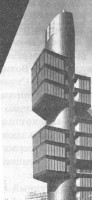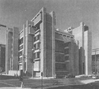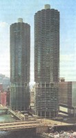 Т.н. Марион-сити в Чикаго: двадцать этажей паркинга, над ними еще сорок этажей тесных и очень плохо приспособленных к меблировке квартир. Все это в рамках формы двух "початков", предельно отчужденных от контекста города, в рамках гордой самодостаточности формы как таковой - финал целой эпохи.