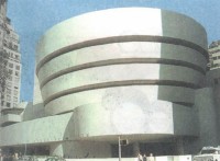 Отстраненность Стоуна, Лапидуса или Портмана от т. н. мейнстрима, лелеемого в университетах, могла сравниться отчасти только с тотальной отчужденностью Ф. Л.Райта от общего потока проектирования. За последние двадцать лет своей долгой жизни Райт построил 180 зданий — столько же, сколько за весь период до 1935 г. Райт строил в разных местах, но никогда в Нью-Йорке. Тем большим шоком для адептов современной архитектуры стало сооружение Музея Гуггенхейма на Парк-Авеню. В самом центре города возникла совершенно антифункциональная постройка (мы уже говорили о том, как сложно организовать музейную экспозицию на спиральной рампе), откровенная скульптура в гладком бетоне. Относительно небольшое в сплошной череде жилых небоскребов, рядом с огромными деревьями Центрального парка, это здание было прямым вызовом.