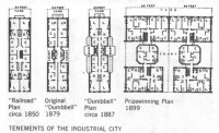 Старое слово tenements, первоначально означавшее доходный дом, населенный тремя или более семьями, стало теперь означать обиталище рабочего класса - наполовину трущобу или вполне трущобу и до сих пор сохраняет отчетливо негативный оттенок в американской версии английского языка. Первые дома такого типа начали специально строить в середине века из лучших побуждений, "чтобы способствовать извлечению бедняков из чудовищных развалин, в которых они обитают", - так публично гласила программа строительства.