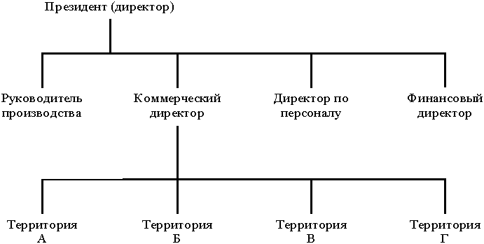 Рис. 1 Примечание. В данном случае функция сбыта осуществляется по географическому признаку, но может быть организована и по признаку выпускаемой продукции или в соответствии с запросами потребителей. Это зависит от того, какому фактору мы отдаем предпочтение. При формировании структур управления во внимание принимаются следующие вопросы: стратификация, то есть сколько может потребоваться уровней управления; формализация, то есть насколько формальным должно быть взаимодействие. Чем более бюрократичен стиль, тем более формальной и системной должна быть внутренняя структура; централизация, то есть иерархия доведения принятых решений, все ли вопросы должно решать высшее руководство; сложность организационной структуры, то есть насколько сложным должно быть управление с организационной точки зрения. Простая иерархия с четким распределением прав и обязанностей легка для понимания, в отличие от матричного типа построения структуры управления, что будет рассмотрено ниже. Определение обязанностей и полномочий. Схемы организации Для эффективной работы организации важно четко и ясно определить функциональные обязанности и полномочия, а также их взаимоотношение. Существуют три метода определения обязанностей и полномочий и их передачи в рамках организации. Каждый сотрудник компании должен понимать, что ожидается от него, какими полномочиями он обладает, какими должны быть его взаимоотношения с другими служащими. Это достигается с помощью схемы организации, дополненной соответствующими справочниками (инструкциями) , и распределения обязанностей. Организационные схемы, таблицы. Слушателю рекомендуется построить схему структуры организации с системой внутренних взаимосвязей. При построении таких схем необходимо учитывать следующее: схема дает лишь общие контуры структуры организации; она должна быть доступна для понимания, содержать минимальное количество деталей; не существует стандартных построений организационной структуры, каждая фирма имеет свои особенности. Схема должна отражать реальную структуру фирмы и не являться своего рода теоретическим стандартом. Если схему структуры трудно составить, то причина может заключаться в том, что сама организация дефектна, то есть с течением времени ее структура стала неэффективной, громоздкой, а линии взаимоотношений стали искаженными. Позитивная сторона использования схематичных построений. На подготовительном этапе построения схемы организации последняя должна быть подвергнута тщательному анализу. Такое исследование само по себе принесет большую пользу, поскольку оно обнаруживает “слабые места” , накладки полномочий, недостаточно управляемые звенья производственного процесса и т.п. Схема позволяет выделить линии взаимозависимости и отношений внутри организации. Как источник получения информации схема может быть использована в рамках ознакомления с деятельностью и структурой управления предприятием (в частности, вновь принятых на работу) , а также в качестве дополнительного наглядного материала при изучении должностных инструкций. Ею можно воспользоваться в качестве основы для возможной реорганизации или модификации структуры организации. Наконец, схема используется в качестве справочного материала, позволяет служащим предприятия быстро ознак