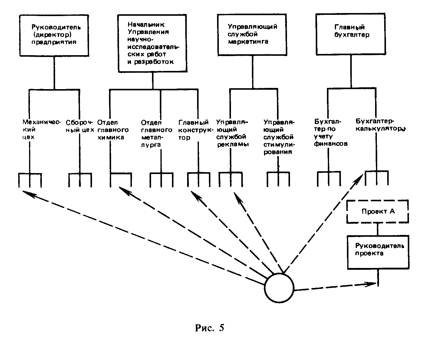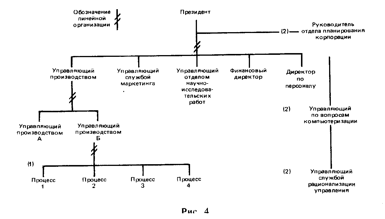 Руководитель отдела планирования корпорации, менеджер по вопросам компьютеризации, начальник службы рационализации управления являются сотрудниками, занимающими должности руководящего аппарата, оказывают помощь или дают свои рекомендации линейным руководителям. Многие учебники называют линейно-функциональное построение функциональным. Это связано с тем, что функциональное построение организации в своем чистом виде — довольно редкое явление. Матричная система построения организации. Такая схема распределения полномочий предназначена для объединения в группу специалистов компании с целью работы над специальным проектом (см. рис. 3) . Построение организации с использованием комиссий. Управленческому аппарату оказывается поддержка со стороны постоянных комиссий, что имеет место сегодня в системе больничного обслуживания. Очень часто комиссия имеет нижестоящую линейную организацию, через которую и осуществляется управление.
