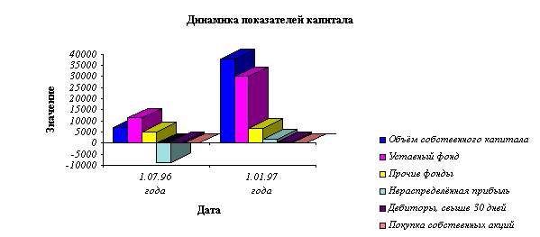 Помимо вышеперечисленных показателей, значение нормативов риска зависит от величины собственных средств (капитала) банка. Следовательно, нарушение вызвано: с одной стороны - превышением допустимой величины риска, с другой - недостаточным размером собственного капитала. Хотя превышение, скорее всего, произошло именно из-за недостаточного размера собственного капитала, так как при малом капитале даже малые риски становятся значительными. Выводы о недостаточности собственных средств подтверждаются динамикой показателей собственного капитала (см. приложение № 8) . По состоянию на 1.07.96 года размер собственных средств банка был ниже зарегистрированного в ЦБ РФ уставного фонда. Это произошло в силу того, что: