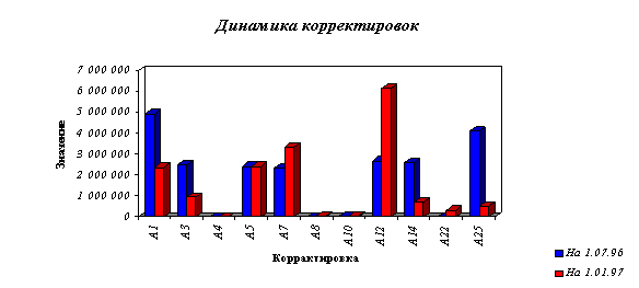 Главное назначение международных стандартов общей финансовой отчетности - сделать её такой, чтобы она могла быть полезна наибольшему числу пользователей для принятия ими экономических решений, например, для оценки депозитов в банке или средств, предоставляемых во временное пользование банку. Представление явной и правильной картины операций коммерческого банка Центральному банку, а также физическим и юридическим лицам, которые являются заёмщиками или депозиторами банка, необходимо для того, чтобы создать и сохранить на средний и долгий срок доверие к банку и кредитной системе в целом. В настоящее время это доверие является особенно важным для России как внутри, так и вне страны. Например, в связи с расширением экономических связей с иностранными партнёрами российской банковской системе необходимо будет составлять и предоставлять достоверную финансовую отчетность, сопоставимую с отчетностью зарубежных партнёров. В целях устранения несоответствий действующего в России плана счетов и международных норм и стандартов в Инструкции № 17, помимо группировки статей, используются корректировки статей: А1-А25, которые исправляют предварительные данные отчетов и максимально приближают их к международным принципам учета. Расчет корректировок в коммерческих банках осуществляется, как правило, автоматически по анализу счетов баланса. В приложении № 12,13 приведены две формы из Инструкции № 17: окончательный балансовый отчет и отчет о прибылях и убытках. Данные формы представляют из себя группировку баланса (приложение № 12) и доходов - расходов (приложение № 13) банка, приближенные к международным нормам и стандартам путём внесения корректировок (значения корректировок на 1.07.96 года и 1.01.97 года с наименованиями приведены в приложении № 14) . Таблица корректировок. Данные приведённой таблицы свидетельствуют о некотором улучшении положения банка: корректировка А1 (недонасозданный резерв на потери по ссудам) снизилась на 51,7 % за пол года, что говорит о начислении средств в данный резерв (данный факт свидетельствует о законопослушании банка) , на 87,8 % по сравнению с 1.07.96 года сократились проценты, просроченные более 30 дней. Вместе с тем, повышается процентный риск, в результате чего, возможно, происходит столь существенная корректировка прибыли банка. Так, проценты к получению от клиентов (А 3) составляют 935 млн. р. (на 1.07.96 года - 2500 млн. р., или снизились на 62,6 %) , в то время как проценты к уплате (А 7) - 3327,9 млн. р. (на 1.07.96 года - 2342,4 млн.. р., или возросли на 42,1 %) . То есть, на момент составления отчетности, банком должны были быть получены (при условии ежедневной выплаты процентов) проценты от клиентов в размере 935 млн. рублей, уплачены же - 3327,9 млн. рублей. На 1.07.96 года: к получению - 2500 млн. рублей, к уплате - 2342,4 млн. рублей. Объяснением этому может служить повышение удельного веса пролонгированных кредитных договоров (по Инструкции № 17 сумма процентов к получению по пролонгированному кредитному договору, не включается в совокупную сумму корректировки А 3) .