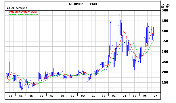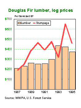 В 1987 году цены на бревна были в среднем равны 190 долларам за тысячу древесных футов по логарифмической шкале (Обычно из бревен лесопилки могут сделать в половину меньше лесоматериалов, а по логарифмической шкале - из 150 древесных футов бревен производится 100 древесных футов пиломатериалов) . Цены на пиломатериалы в этом году составляли 209 долларов за тысячу древесных футов. После снижения поставок леса цены на бревна стали расти значительно быстрее, чем на пиломатериалы. К 1992 году тысяча древесных фунтов бревен поднялась в цене до 477 долларов, что означало повышение цен на бревна на 150 %. При этом цены на лесоматериалы выросли только на 43 %. После пика цен на лесопродукты в 1993 году, они начали снижаться. К 1994 году цены на бревна скакнули до 652 долларов, после чего в 1995 году бревна продавались за 453 доллара за тысячу древесных футов. В итоге можно сказать, что цены на бревна выросли с 1987 по 1995 годы на 263 доллара за древесный фут, т.е. по логарифмической шкале - более чем вдвое. Для сравнения, цена которую стали получать лесопилки за тысячу древесных футов за это же время выросла всего на 166 долларов. Цены на пиломатериалы и инфляция В отличие от других строительных материалов, цены на пиломатериалы не повышаются в зависимости от инфляции. Даже если принимать во внимание последний скачек цен, реальные цены на лесоматериалы в настоящий момент с поправкой на инфляцию все еще ниже высшего уровня, зафиксированного в конце 70-х годов. Согласно статистике, средние цены на лес за первые 9 месяцев 1996 года были равны 429 долларам за тысячу древесных футов, а рекордные цены были зафиксированы в октябре 1979 года и равнялись 286 долларам. Приведенные по инфляции цены на сегодняшний день приблизительно на 25 % ниже достигнутого ранее уровня максимальных цен. Если бы цены на пиломатериалы держались на том же максимальном уровне, то они составили бы на настоящий момент приблизительно 556 долларов за тысячу древесных футов, что на 136 долларов выше текущей средней цены. Воздействие факторов предложения леса может быть отслежено на трендах приведенных по инфляции цен на лес. С 1985 по 1989, при том, что лесопилки имели требуемый им доступ к ресурсам для удовлетворения спроса, реальные цены на пиломатериалы варьировались менее чем на 10 процентов из года в год. В 1990 году доступ к лесным ресурсам снизился и цены на пиломатериалы возросли значительно. Цены, приведенные по инфляции за 1990-1996 годы (средние за 9 месяцев) варьировались в пределах более 9 процентов в отличие от предыдущих лет в четырех из шести лет этого временного промежутка. Некоторые факторы, воздействующие на цены Несмотря на то, что основные влияющие на данный рынок факторы ясны, остаются и некоторые другие. Например, летом рынок может быть стабильным, с низкими ценами в результате жары в некоторых районах США и вследствие этого - малой активности на лесных биржах. Другим фактором можно считать национальные праздники, в которые в США наблюдается снижение деловой активности, а также разгар отпускного сезона. Последний, однако, влияет на цены в сторону их повышения, т.к. это время строительного бума у населения региона. Также на цены на рынке леса действуют цены на нью-йоркском рынке государственных облигаций Министерства финансов США. Кроме того, можно с уверенностью сказать, что любое повышение Федеральным рез