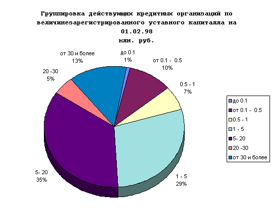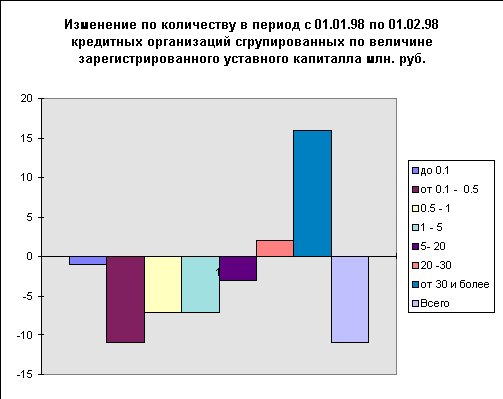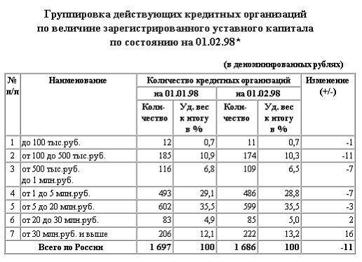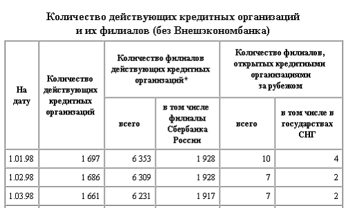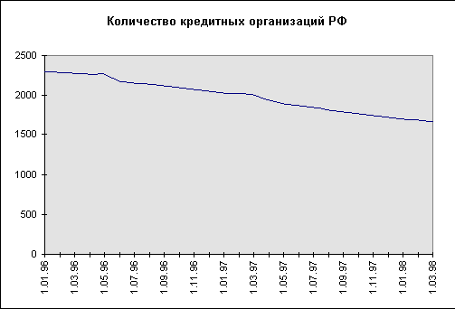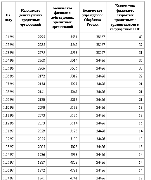 На фоне консолидации капитала и активов банковской системы России, снижения доходности банковских операций на рынках продолжается сокращение количества кредитных организаций. В 1997 году темпы сокращения действующих кредитных организаций (16,3 %) возросли по сравнению с 1996 годом (11,6 %) . В связи с увеличением Банком России минимального размера уставного капитала при создании кредитных организаций, ужесточения требований при выдаче лицензий, заметно сократилось количество вновь создаваемых кредитных институтов. В 1997 году зарегистрировано только 12 новых кредитных организаций (в 1996 году - 28) , из них три – полностью контролируемые иностранным капиталом. (см таблицы 4,5 и диаграмму 3) Таблица 4. Количество действующих кредитных организаций и их филиалов (без Сбербанка России и Внешэкономбанка)