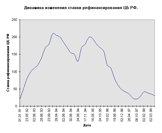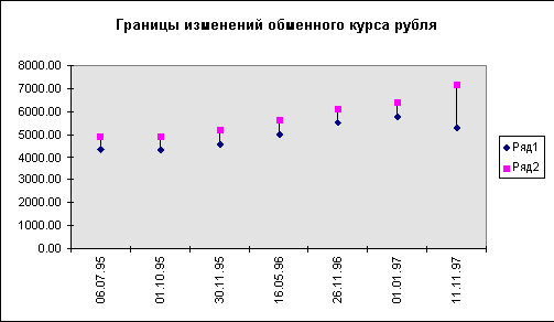 Проводимая с середины 1995 года курсовая политика Банка России, направленная на стабилизацию и предсказуемость обменного курса рубля, сыграла важную роль в нормализации макроэкономической ситуации в России. Практика установления Банком России границ допустимых изменений обменного курса рубля обеспечила предсказуемую динамику валютного курса в 1995-1997гг. Достигнутый прогресс в области финансовой стабилизации впервые позволил установить в 1997 году границы валютного коридора на весь год. Учитывая возросшую степень интеграции России с мировыми финансовыми рынками и следуя курсу на предсказуемость и преемственность политики, Банк России принял решение о переходе от практики установления краткосрочных ограничений на изменение курса российского рубля к определению среднесрочных ориентиров его динамики. В качестве такого ориентира как минимум на 1998 - 2000 гг. определен центральный курс 6,2 рубля за 1 доллар США с допустимыми отклонениями от него в пределах 15 % в обе стороны. В 1998 году Банк России будет стремиться к сохранению среднего значения обменного курса рубля на уровне 6,1 за 1 доллар США (см Диаграмму 2 построенную по данным публикуемым на официальном электронно-информационном сервере Банка России) Диаграмма 2.