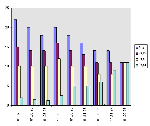 Ряд-1 Нижняя граница Ряд-2 Верхняя граница 11.11.97 С 1 января 1998 г. на трехлетний период (1998-2000 гг.) устанавливается центральный обменный курс на уровне 6,2 рубля за один доллар США (после деноминации) , возможные отклонения не могут превышать 15 %. В целях защиты и обеспечения устойчивости рубля, повышения привлекательности накоплений в национальной валюте, сдерживания процесса перетока свободных средств на покупку иностранной валюты, Банк России осуществляет политику дальнейшего выравнивания нормативов обязательных резервов по всем привлеченным средствам (в рублях и иностранной валюте) путем снижения нормативов по привлеченным средствам в валюте Российской Федерации с одновременным увеличением норматива по привлеченным средствам в иностранной валюте. Банк России намерен также продолжить политику, направленную на снижение общего уровня обязательных резервных требований по мере увеличения спроса на деньги со стороны экономических агентов. (см Гистограмму 3, построена по данным публикуемым на официальном электронно-информационном сервере Банка России) Гистограмма 3. Норматив обязательных резервов по привлекаемым банками средствам в рублях и иностранной валюте.