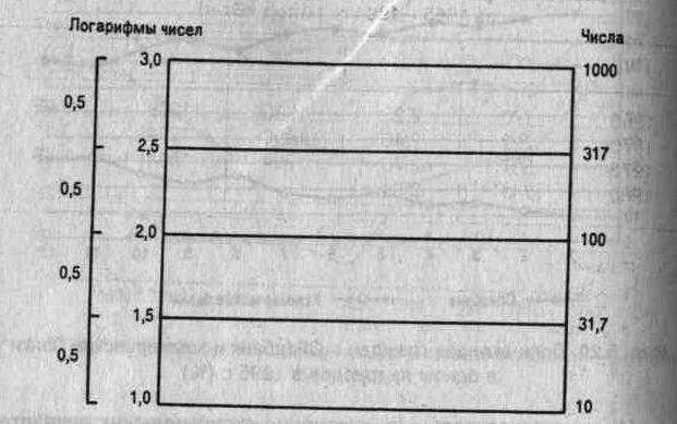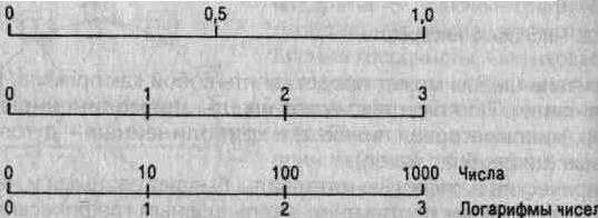 Необходимо найти логарифмы исходных чисел, начертить ординату и разделить ее на несколько равных частей. Затем нанести на ординату (или равную ей параллельную линию) отрезки, пропорциональные абсолютным приростам этих логарифмов. Далее записать соответствующие логарифмы чисел и их антилогарифмы, например (0,000; 0,3010; 0,4771; 0,6021;... ; 1,000, что дает 1,2,3,4,..., 10) . Полученные антилогарифмы окончательно дают вид искомой шкалы на ординате.