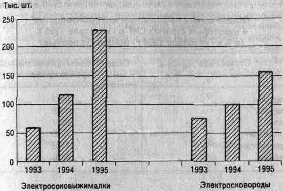 Рис. 10. Динамика производства некоторых видов товаров хозяйственного потребления за 1993-1995 гг.
