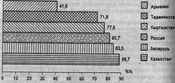 Рис. 11. Общий объем промышленного производства в странах СНГ в I квартале 1995 г. (в % к I кварталу 1994 г.)