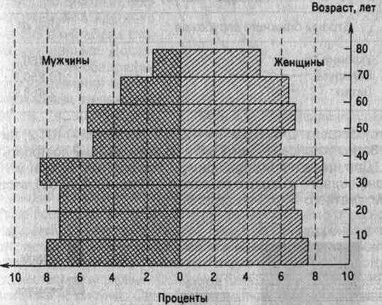 Рис. 12. Распределение населения одного из регионов России по полу и возрасту в 1995 г.