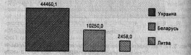 Это составит: для Украины - 210,9; Беларуси - 101,2; Литвы -49,6. Затем установить масштаб и по этим данным построить квадраты. Для нашего примера примем 1см равным 30 млн. м 3 . Тогда сторона первого квадрата составит 7,03 см (210,9: 30) ; второго-3,4 см; третьего - 1,65 см (рис. 13) .