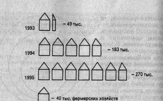 Примем условно за один знак 40 тыс. фермерских хозяйств. Тогда число хозяйств в России в 1993 г. в размере 49 тыс. будет изображено в количестве 1,22 хозяйства, в 1994 г. - 4,6 хозяйства и т.д. (рис. 15) .