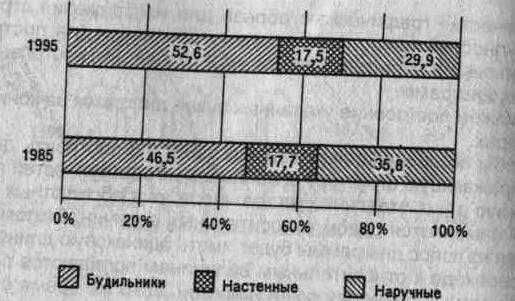 Чтобы по приведенным данным табл. 5 построить диаграмму, отражающую структуру сравниваемых совокупностей по соотношению в них отдельных видов часов, ряд абсолютных показателей заменяется рядом относительных величин. В этом случае каждая из полос диаграммы будет иметь одинаковую длину, так как при переходе к относительным величинам погашаются различия в абсолютных размерах совокупностей. В то же время структурные различия проявляются значительно четче. Графическое изображение структуры с помощью столбиковых (полосовых) диаграмм позволяет изучить особенности многих изучаемых экономических явлений. Так, приведенная на рис. 16 диаграмма, построенная по данным табл. 5, характеризует увеличение доли наручных часов в общем производстве.