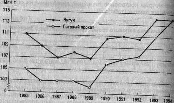 Рис. 19. Динамика производства чугуна и готового проката в регионе за 1985-1994 гг.