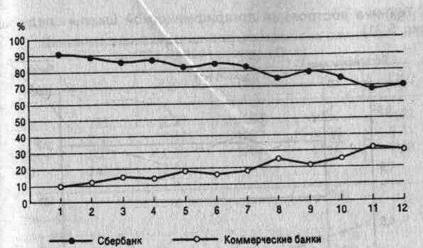 Рис. 20. Доли вкладов граждан в Сбербанк и коммерческие банки в одном из городов в 1995 г. (%) Именно относительные изменения экономических показателей в динамике искажаются при их изображении на координатной диаграмме с равномерной вертикальной шкалой. Кроме того, в обычных координатах теряет всякую наглядность и даже становится невозможным изображение для рядов динамики с резко изменяющимися уровнями, которые обычно имеют место в динамических рядах за длительный период времени.