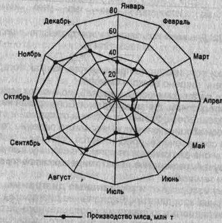 Минимум производства мяса приходится на апрель, май, затем наблюдается медленное его повышение к августу, резкий подъем в сентябре, октябре и опять спад в декабре, январе. Если же в качестве базы для отсчета взять не центр круга, а окружность, то диаграммы называются спиральными.