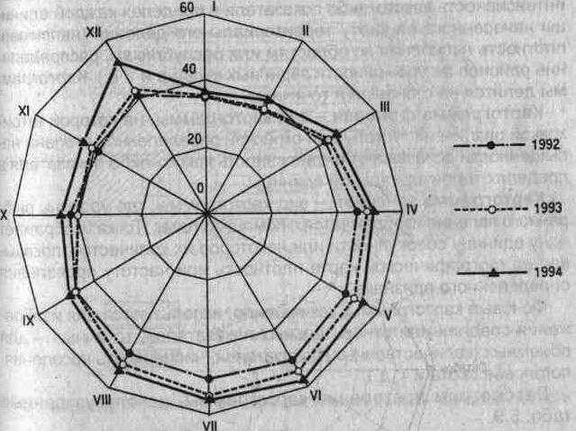 Построение замкнутых диаграмм сводится к следующему: вычерчивается круг, среднемесячный показатель приравнивается к радиусу этого круга. Затем весь круг делится на 12 радиусов, которые на графике приводятся в виде тонких линий. Каждый радиус обозначает месяц, причем расположение месяцев аналогично циферблату часов: январь - в том месте, где на часах 1, февраль - 2, и т.д. На каждом радиусе делается отметка в определенном месте согласно масштабу исходя из данных за соответствующий месяц. Если данные превышают среднемесячный уровень, отметка делается за пределами окружности на продолжении радиуса. Затем отметки различных месяцев соединяются отрезками. В приведенном примере (рис. 5.23) К = 44,8 тыс. т., длина радиуса - 3,0 см. Следовательно, 1 см = 44,8: 3,0 " 15 тыс. т. Данная замкнутая диаграмма наглядно показывает, что производство мяса подвергнуто сезонным колебаниям.