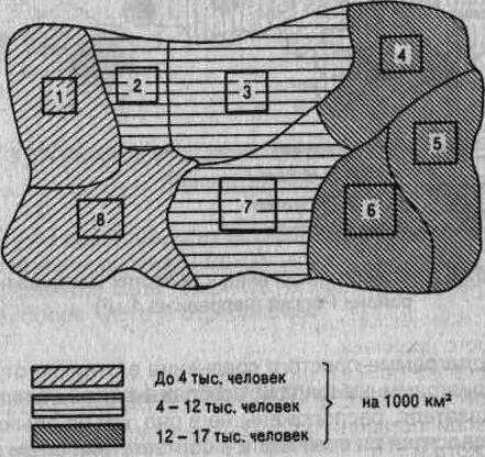 Согласно данным табл. 5.9 все районы по плотности населения можно разбить на три группы: 1) районы, имеющие плотность населения до 4 тыс. человек; 2) от 4 до 12 тыс. человек; 3) от 12 до 17 тыс. человек. Тогда к первой группе относятся районы є 1,8; ко второй - є 2,3,7; к третьей - є 4,5,6. Если принять для каждой группы районов окраску различной насыщенности, то на фоновой картограмме хорошо видно, как располагаются на территории области отдельные районы по плотности населения (рис. 25) . Другим примером фоновой картограммы является рис. 26.