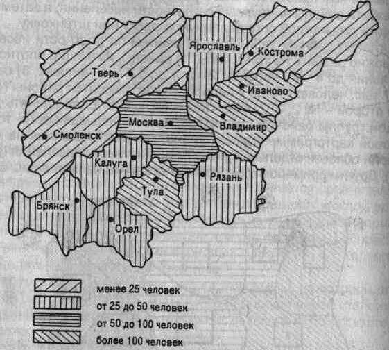 Рис. 26.. Плотность населения в областях Центрального района России (человек на 1 м 2 )