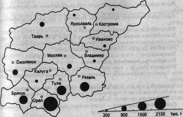 В качестве примера картодиаграммы возьмем изображение валового сбора зерна Центрального района России (рис. 27) .