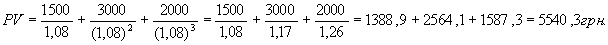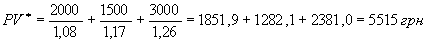 ) . Действительно, положим, что в приведенном выше примере доход предпринимателя распределился по годам следующим образом: 2000 грн. в первый год, 1500 грн. во второй год и 3000 грн. в третий год. В этом случае дисконтированная стоимость станка составит: