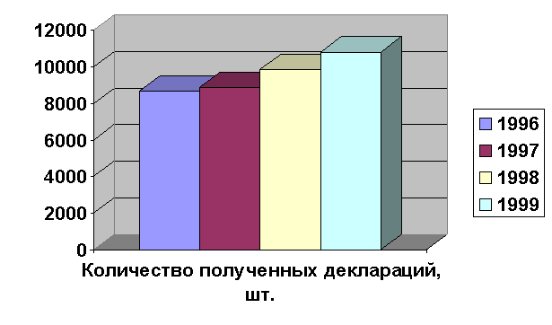 Особенно это видно из приведенной на рис. 5. диаграммы динамики поступления деклараций в налоговую инспекцию по г. Благовещенску от физических лиц, занимающихся предпринимательской деятельностью и на Рис. 6 диаграммы динамики исчисления подоходного налога по декларациям по г. Благовещенску от физических лиц, занимающихся предпринимательской деятельностью