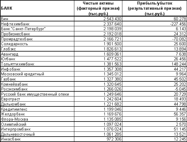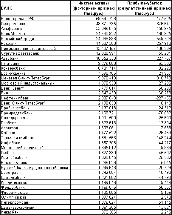 Корреляционно-регрессионный анализ зависимости прибыли 40 банков от их чистых активовЗадание №1. Произвести выборку 40 банков, пользуясь таблицей случайных чисел. Затем по отобранным единицам выписать значения факторного и результативного признаков.