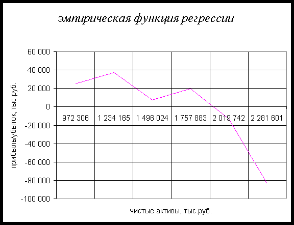 Пункт №4 Рассчитать параметры уравнения регрессии, оценить его качество и достоверность, используя среднюю квадратическую ошибку. Дать оценку результатов исследования взаимосвязи в целом. Определяется модель связи. График эмпирической функции регрессии и величина w 2 показывают наличие линейной связи, поэтому используется функция ŷ = a + bx. b= (S xЧ y – nЧ x Ч y) / (S x 2 - nЧ (x) 2 ) = -0,05 a= y - bЧ x = 93 099,35 ŷ = 93 099,35 – 0,05Ч x - модель связи. Все данные для расчетов содержатся во вспомогательной таблице (см. приложение 2) . Средняя квадратическая ошибка уравнения: S l = Ц (S (y-ŷ) 2 / (n-l) ) = 58 723, где ŷ – значения результативного признака, рассчитанные по уравнению связи, l – количество параметров уравнения регрессии. (S l / y) Ч 100 = (58723/14933) Ч 100=393% Полученное отношение значительно больше 15%, поэтому уравнение достаточно плохо отображает взаимосвязь двух признаков и не может быть использовано в практической работе. По результатам исследования можно сделать вывод о том, что, хотя теоретически между чистыми активами банков и их прибылями должна существовать прямая тесная связь, на практике же мы показали наличие довольно слабого влияния факторного признака на результативный. Это не совпадение может объясняться рядом причин: во-первых, ошибочными теоретическими предположениями, во-вторых, некачественной, нерепрезентативной выборкой, и, наконец, в-третьих, ошибками, допущенными в исследовании, которых, может быть, не удалось избежать.