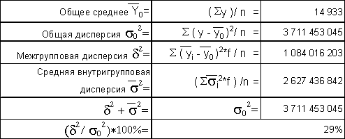 Как видно из данных групповой таблицы, с увеличением величины чистых активов банков уменьшается величина прибыли банков. Эмпирическая линия связи приближается, в общем, к прямой линии. Следовательно, можно предполагать наличие обратной линейной связи. Пункт №2 Проверить правило сложения дисперсий и сформулировать вывод о степени влияния факторного признака на величину результативного признака. Нижеследующие показатели были рассчитаны на основе данных групповой таблицы и вспомогательной таблицы (см. приложение 2) .