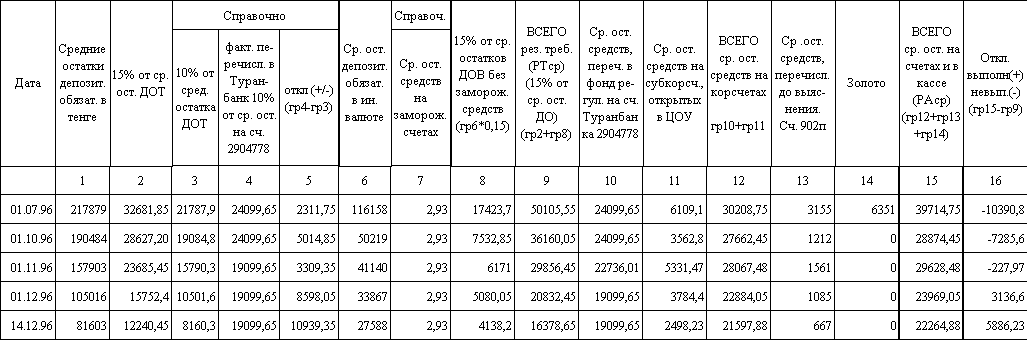 Таблица 16 Данные о резервных требованиях по Алматинскому управлению Туранбанка. тыс. тенге.