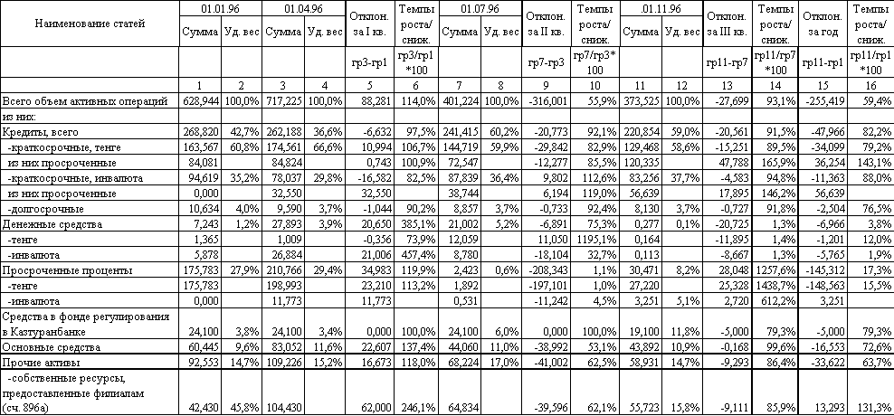 Кредитные ресурсы выделялись Реабилитационным банком сроком на 3 месяца. По просьбе Алматинского управления Реабилитационный банк продлил срок возврата до 28.06.1996 г. Однако ресурсы согласно договора не возвращены и на сегодняшний день остаток по договору в сумме 40100 тыс. тенге является просроченным. Проценты по договору не уплачены в полной сумме с даты заключения договора, то есть с 17.01.1996 г. по 28.06.1996 г. уплачено 15084,7 тыс. тенге, а за период с 29.06.1996 г. по 31.12.1996 г. проценты не уплачены и причитается заплатить 10142,0 тыс. тенге. Кроме того Управлением выделялись за счет собственных средств Алмалинскому отделению (счет 896) кредитные ресурсы в сумме 12309 тыс. тенге. - 37000 тыс. тенге - ресурсы Казтуранбанка. Средства, выделены МЧП “Абылайхан” . Из них 22000 тыс. тенге числятся за Управлением с прошлого года, 15000 тыс. тенге выделены 7.02.1996 г. Данные кредитные ресурсы многократно пролонгировались, снижалась процентная ставка, на сегодняшний день они полностью просрочены и плата по ним не уплачена. Причитающаяся плата за кредитные ресурсы отражена на счете 948704 в сумме 16916,0 тыс. тенге - 12500 тыс. тенге - кредитные ресурсы, полученные Московского отделения Туранбанка на поддержание корсчета. - 90 тыс. тенге - бесплатные кредитные ресурсы Национального банка (счет 893) , выделенные на мобилизационные резервы. Данные кредитные ресурсы направлены на покрытие счета 820 “Кредиты на мобрезервы” . По состоянию на 1.12.1996 г. имеется разница между выделенным лимитом (счет 893) и задолженностью (счет 820) , которая прокредитована за счет собственных средств, что противоречит инструкции Госкомитета по матрезерву “О порядке финансирования, кредитования и бухгалтерского учета матрезервов” от 1.12.1992 г. Достаточность средств на приобретение основных средств. При проблемах с текущей ликвидностью большую роль играет размер основных средств и достаточность средств на приобретение основных средств, которые показаны в таблице №17 Для покупки основных средств необходимо соблюдать соотношение, установленное Национальным банком. Данное соотношение не соблюдено и разница превышения счетов актива над счетами пассива растет. Основной причиной невыполнения достаточности является состояние кредитного портфеля Алматинского управления. В соответствии с указаниями Национального банка в случае превышения суммы указанных счетов актива баланса над счетами пассива, основные средства необходимо либо получить в финансовый лизинг, либо получить долгосрочный кредит на их покупку. О состоянии и использовании кредитных ресурсов, выполнении экономических нормативов и мероприятий по оздоровлению деятельности Управления Направление ресурсов за 1996 г. характеризуется следующими данными, приведенными в таблице №18. Как видно из таблицы, объем активных операций по Алматинскому Управлению по сравнению с 1.07.1996 г. снижен на 6,9 пунктов и на 1.11.1996 г. составил 373,5 млн. тенге, в том числе кредиты - 220,8 млн. тенге, из них в национальной валюте - 129,5 млн. тенге (58,6% от объема кредитования) , в инвалюте - 83,3 млн. тенге (37,7%) , долгосрочные кредиты - 8,1 млн. тенге (3,7%) и остальные активы - 152,7 млн. тенге. Уменьшение объема активных операций в основном связано с уменьшением объема кредитования (на 20,5 млн. тенге) , а также с резким уменьшением прочих активов (на 9,1 млн. тенге) . Не обеспечивается своевременное гашение выданн