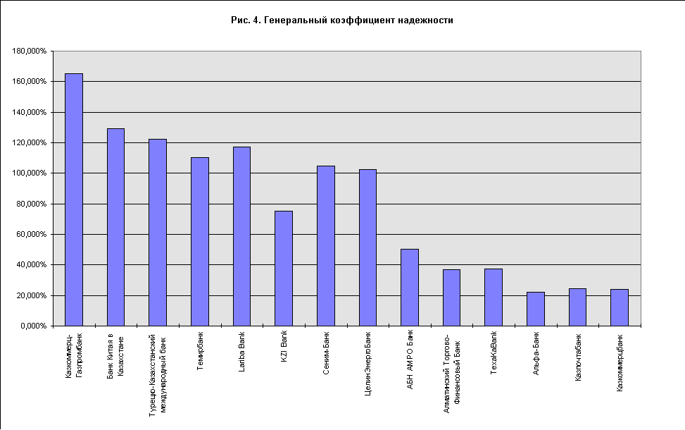 Таким образом, для определения “вектора надежности” любого коммерческого банка, участвующего в рейтинге, необходимо рассчитать по его балансовым счетам пять коэффициентов надежности, затем отнормировать результат, и с учетом весов сложить. Формула в общем виде для определения “вектора надежности” банка следующая: